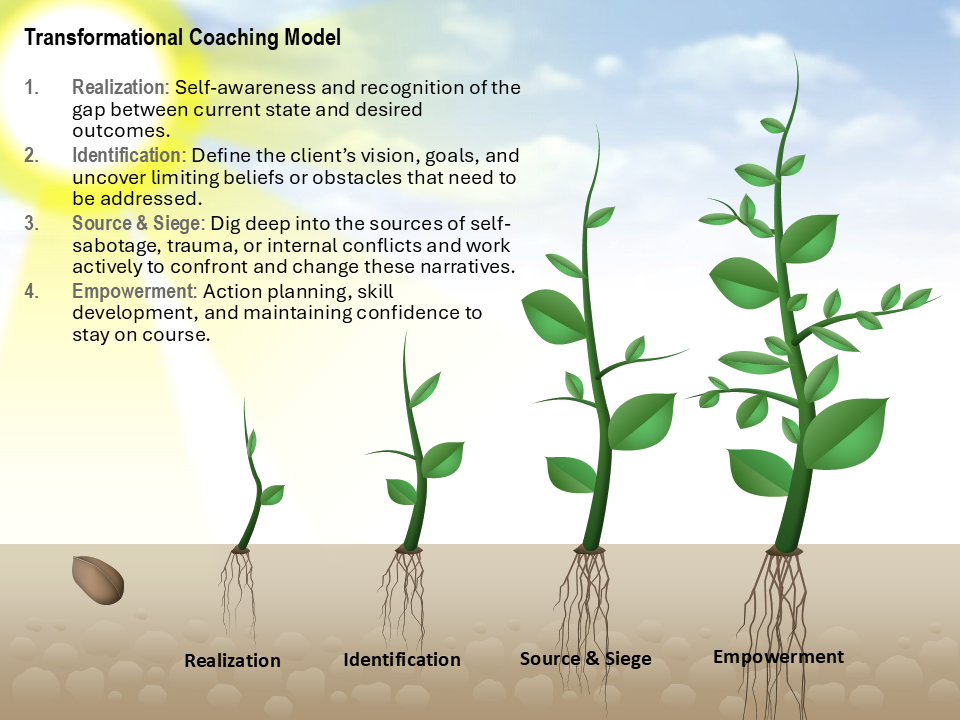 This is our Transformational Coaching Model based on four core stages: Realization, Identification, Source & Siege, and Empowerment. This model is designed to guide individuals through a structured process of self-awareness, discovery, and action, ultimately leading to meaningful and sustainable change.